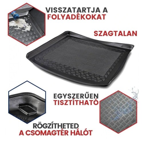 Esztétikus, erős anyagú csomagtérvédő tálca, mely fekete színű, nagyon strapabíró, de mégis hajlékony műanyagból készül, 5 cm magas peremmel. A tácán lévő magas perem, megvédi a szennyeződésektől, kiömlő folyadékoktól az autó kárpitját.